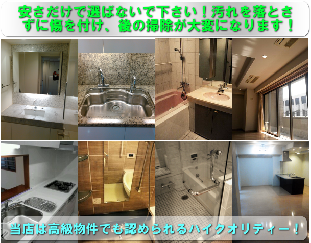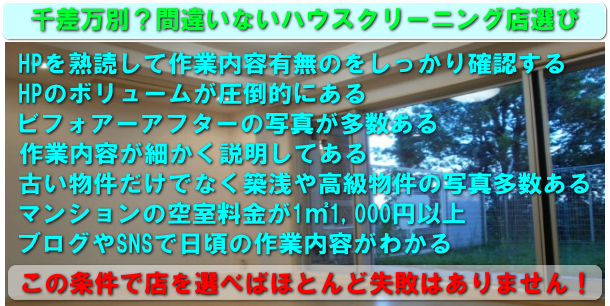 数あるハウスクリーニング店の中で失敗しないお店選びをお教えます。ネットで何店か良さそうなハウスクリーニング店を見つけたらHPは面倒でも必ず全て目を通して下さい。HPのボリュームが圧倒的にありバリエーションの多い写真(古い賃貸だけではない)を他より多数載せているハウスクリーニング店は良いお店です。フランチャイズ店は作業レベルは安定していますが料金設定が同じ(質の良いサービスの為に高くできない)こととロイヤリティが発生するので特別良いお店はHPからわかりにくいです。フランチャイズで開業して顧客が増えて人気店になると契約解除するお店も珍しくないです。作業内容は細かく説明してあり水まわりの設備や大きさ等で細かく料金設定がある店のほうが広いキッチンや高級な浴室の場合は仕上がりが良いと言えます。水まわりの設備が高級の方が手間がかかりますので細かい料金設定ある店は色々な設備の依頼が多いと言えます。空室クリーニングの料金は1u1,000円以上を選ぶのが基本だと思います。賃貸を中心で作業している業者は比較的簡素な水まわりの設備に1〜3年の浅い汚れを落とすので50u2LDK25,000円の仕事もよくあります。しかし分譲の中古物件は長年の汚れが蓄積している上に水まわりの設備が段違いに良いのでかかる手間が全く違います。手間を考えると50u50,000円でも安い位です。安い料金を設定している業者には高い技術をもった作業員は少ないですし、高い技術を全力で出す作業員も少ないです。ブログやSNSは日頃の作業がわかります。日頃同じ下請けの1Kばかりの業者でしたら毎日同じ内容なのでブログ等書けません。賃貸や分譲、マンションや戸建て築30年から築浅など様々な現場の様々な汚れを試行錯誤している業者は自然にレベルが高くなりますので是非ブログもチェックして下さい。色々と書きましたがHPが充実していなくブログも書いていないのにレベルが高い業者ももちろんあります。しかし安すぎる業者は仕事が足りないから安くして集客を増やすも仕上がりが良くないからリピートしないので、それ以上集客が増えず料金は安いままです。やはり安いサービスは選ぶべきではありません。